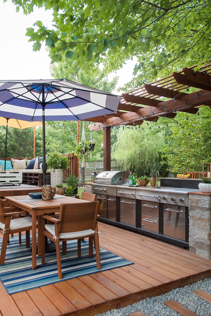 The Pergola, Budgeted If you want to save some money on your outdoor kitchen space, building a small pergola structure may be for you! The large elaborate tiling for the patio is quite beautiful and takes centerstage, along with the stone decorative elements by the stainless steel barbecue. A Modern Pergola