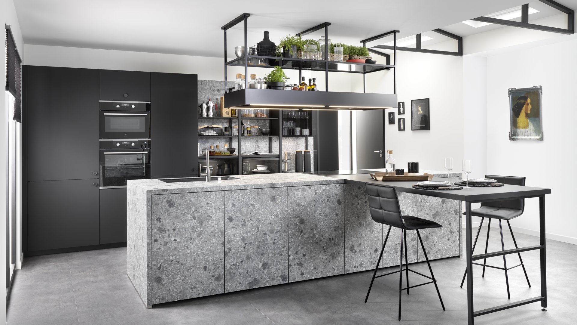 A typical T-shaped island consists of an expansive island space (the top arm of the T) intersected by a smaller seating area (the vertical bar of the T). However, depending on available space and desired seating, you can certainly flip this dynamic around, as in this contemporary kitchen.