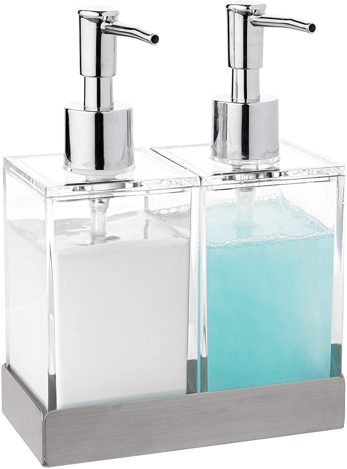 Acrylic Twin Liquid Soap and Lotion Dispenser Set with Caddy - Double Soap Dispenser for Kitchen Sink - Clear Soap Dispenser for Bathroom, Shampoo, ...