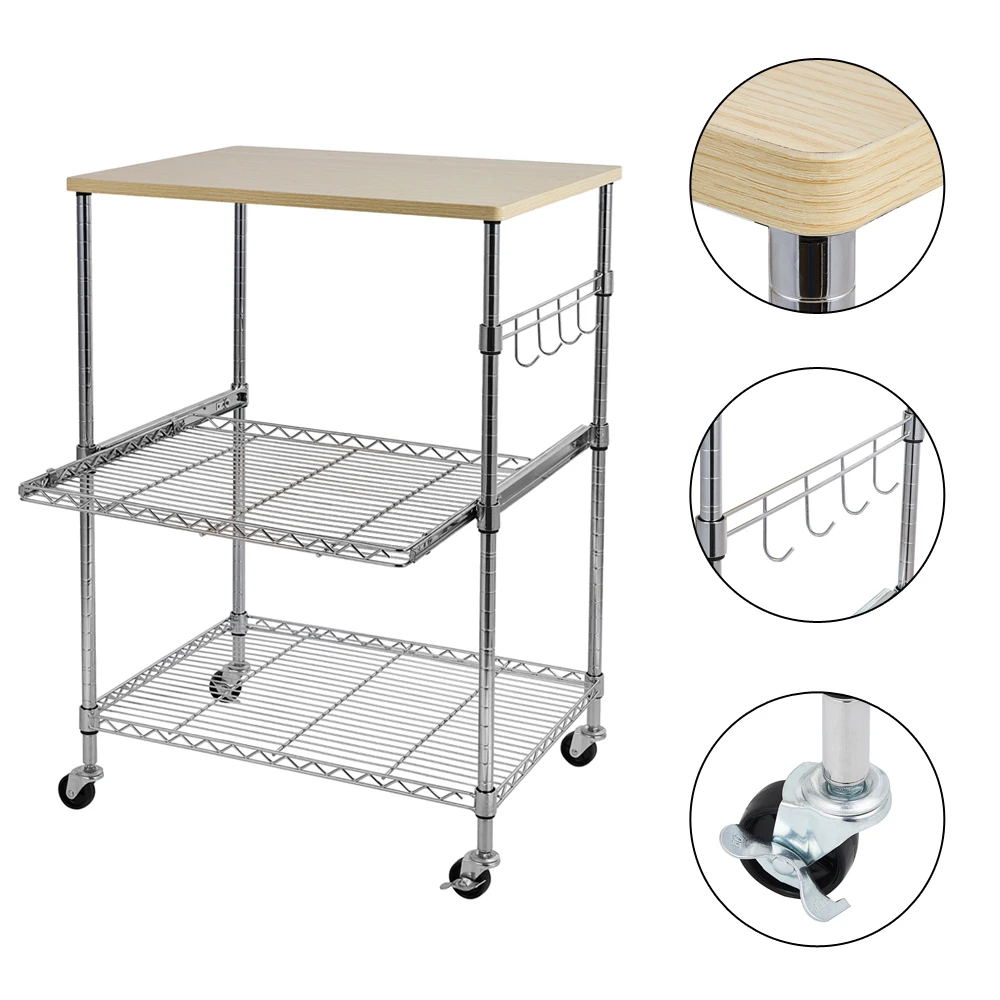 3-Tier Wire Rolling Kitchen Cart Baker's Rack Utility Storage Shelf Microwave Stand Organizer Workstation with Hooks[US-Stock]