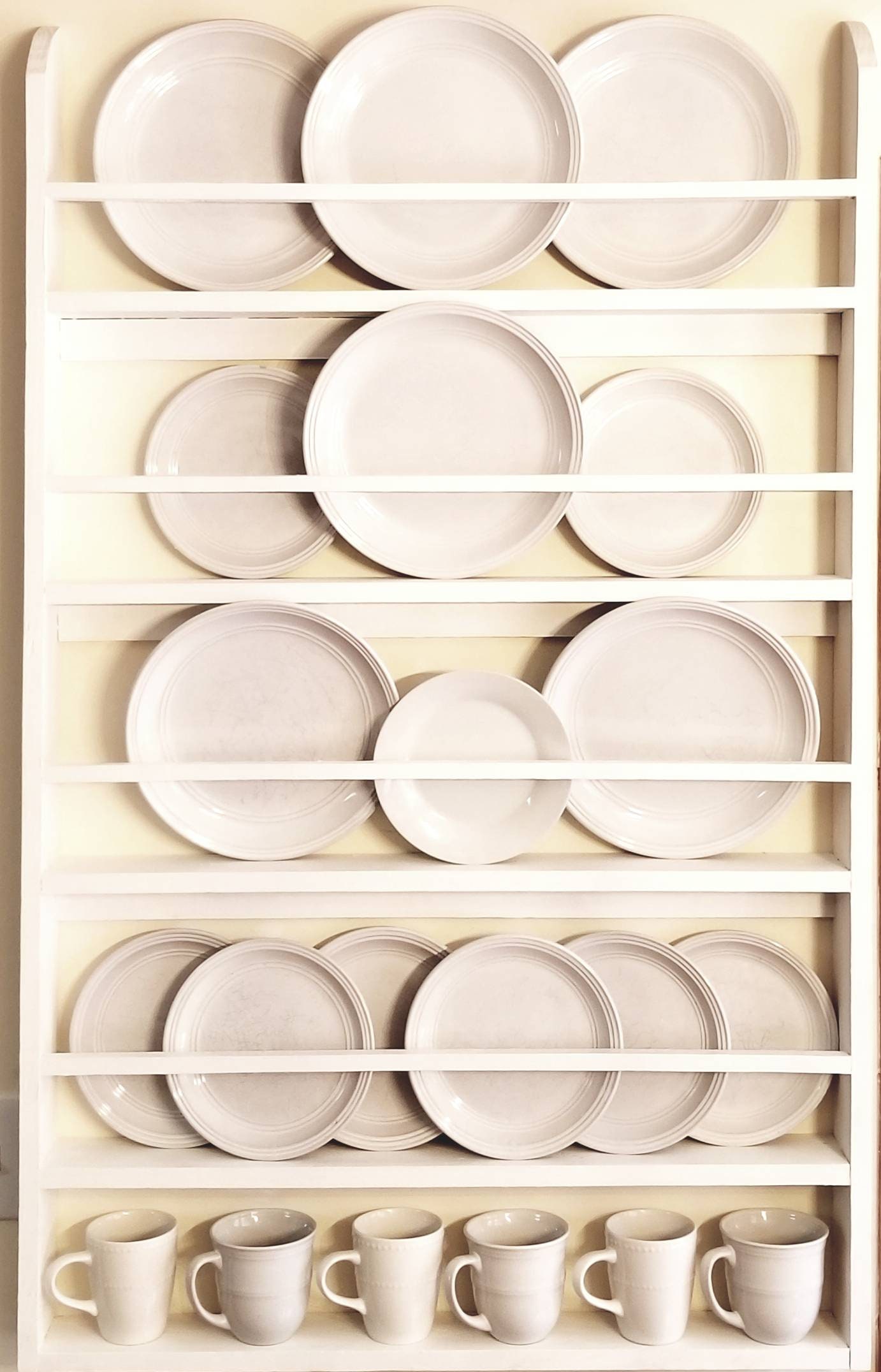 Wall Mounted Plate Rack - Cupboards & Goods Wall Mounted Plate Rack. 8 500.00 kr. This plate rack is made of solid wood. Select your favourite colour to match the signature Shaker kitchen style and enjoy its inherent beauty, craftsmanship and practicality. W 1044 • H 1058 • D 340.
