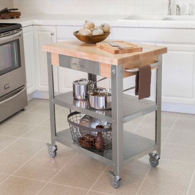 John Boos Walnut Wood Top Kitchen Cart in Stainless Steel Add sleek storage space with the John Boos Kitchen Cart. Boosting a handsome walnut top with ample drawer and shelf space, its made in stainless steel hardware. With a towel bar and easy-roll wheels, it's durability with maximum versatility.