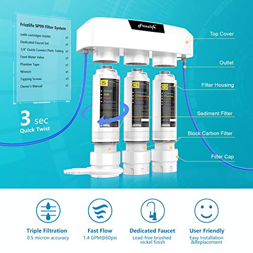 Frizzlife Under Sink Water Filter System with Brushed Nickel Faucet SP99, 3-Stage 0.5 Micron ...