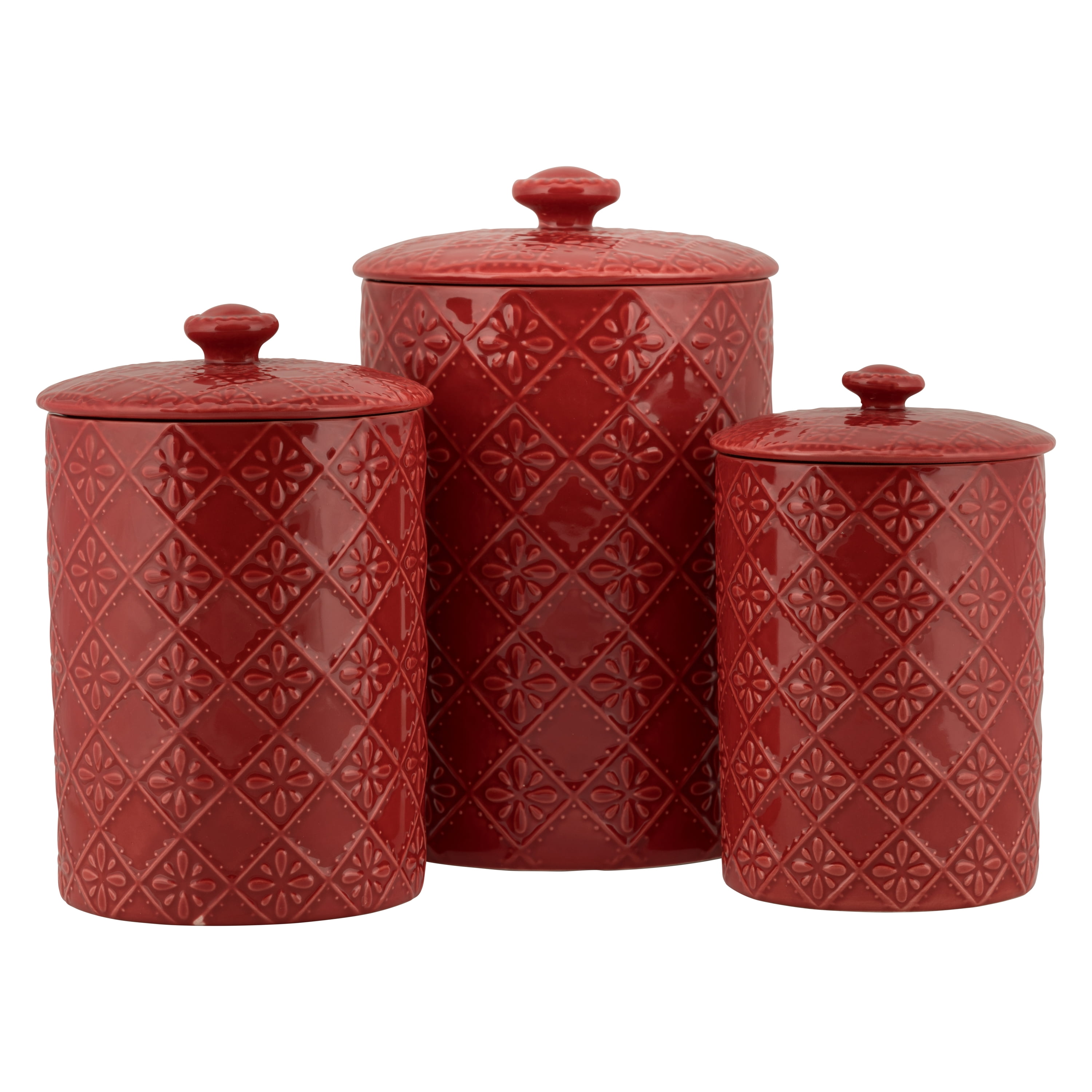 THE 15 BEST Kitchen Canister Sets for 2022 | Houzz Find the best Canister Set Kitchen Canisters & Jars for your home in 2022 with the carefully curated selection available to shop at Houzz. Whether you are looking for Canister Set Kitchen Canisters & Jars that can mix and match colors, materials, styles, or want Kitchen Canisters & Jars with a unique, one-of-a-kind feature, you’ll be able to find the perfect piece right here! Red Apple Canister Set - Wayfair Dotted Ceramic 2 Piece Kitchen Canister Set (Set of 2) by George Oliver. $47.99 ( $24.00 per item) 1. Rated 5 out of 5 stars. 1 total vote. Free Shipping. Accentuate your home interior with the inclusion of this cannister accented in the vibrant red color finish with dotted design on the frame. Red Diamond Ceramic Canisters, Set of 3 | Kirklands Home Our Red Diamond Ceramic Canister Set is perfect for storing all your baking or cooking essentials! This charming set will add a great pop of color to your counters. Set includes three (3) canisters; Large canister measures 7.5H x 5.5 in. in diameter; Medium canister measures 6H x 4.5 in. in diameter; Large canister measures 5.5H x 3.75 in. in ... Anchor Hocking® 4 Piece Ceramic Canister Set; Red - Quill Anchor Hocking® 4 Piece red ceramic canister set is perfect for any pantry. Canister set top lids are made of stainless steel for durability and is perfect for food storage as they provide an airtight seal to preserve freshness. Includes spoon, 27.05 oz., 33.48 oz., 47.01 oz., 40.58 oz. canisters. Gift boxed.