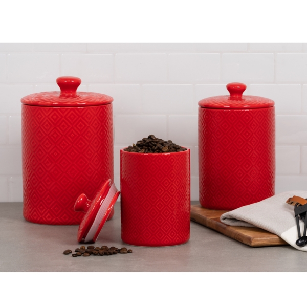 If you'd rather keep dry goods concealed, opt for a wood kitchen canister with a label instead. Hand brew a warm beverage when the cold sets in with coffee beans and tea leaves in a set of ceramic canisters. Place them together on top of the refrigerator or on different shelves in the cabinet. Canisters can be used elsewhere in the house, too. Dotted Ceramic Lidded Cannister, Set of 2, Red and Brown ... Shop for Dotted Ceramic Lidded Cannister, Set of 2, Red and Brown. Get free delivery On EVERYTHING* at Overstock - Your Online Kitchen & Dining Destination! Get 5% in rewards with Club O! - 32771026 Red Ceramic Kitchen Canister Set - Etsy Red Ceramic Kitchen Canister Set $64.99 Low in stock Add to cart Selling fast! Only 7 left, and 4 people have it in their carts. Highlights Handmade Materials: Ceramic Description Hand painted ceramic canister set, glazed inside and outside. Canister sizes are random each order. Canister Measure Approx. (Including Lid) Small- 7.5"H x4.5"W
