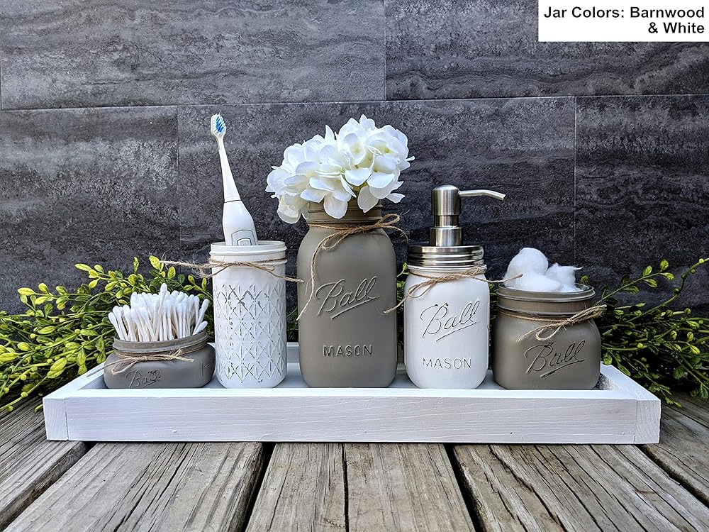 Amazon.com: Bathroom Mason Jar Decor Set With Soap Dispenser. Optional White Wooden Tray. Set of ...
