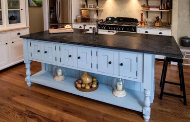 Wood And Wrought Iron Kitchen Shelves Design Ideas - Page 1 Stylish, well appointed kitchen boasts three wrought iron and leather backless counter stools placed at a black kitchen island illuminated by three glass and brass globe lanterns hung over a black stone countertop finished with a sink with a polished nickel deck mount faucet. Salt Box Collective view full size