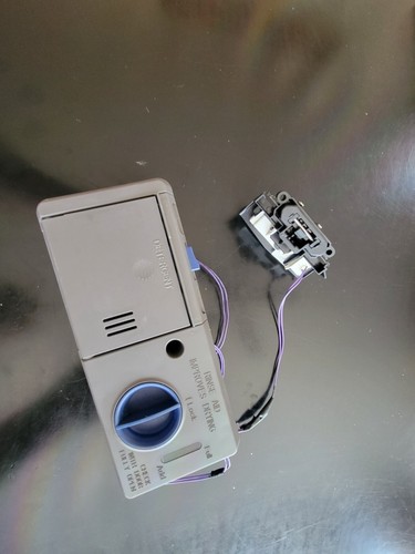 KitchenAid Dispenser Parts: Fast Shipping Dishwasher detergent dispenser assembly. This new dispenser has a mechanical rinse aid indicator. If the original dispenser had a rinse aid sensor with a two wire harness, that is no longer required. The two wire harness is not used and can be tied to the door wiring harness so it is out of the way. OEM Part - Manufacturer #WP8558129 $100.38