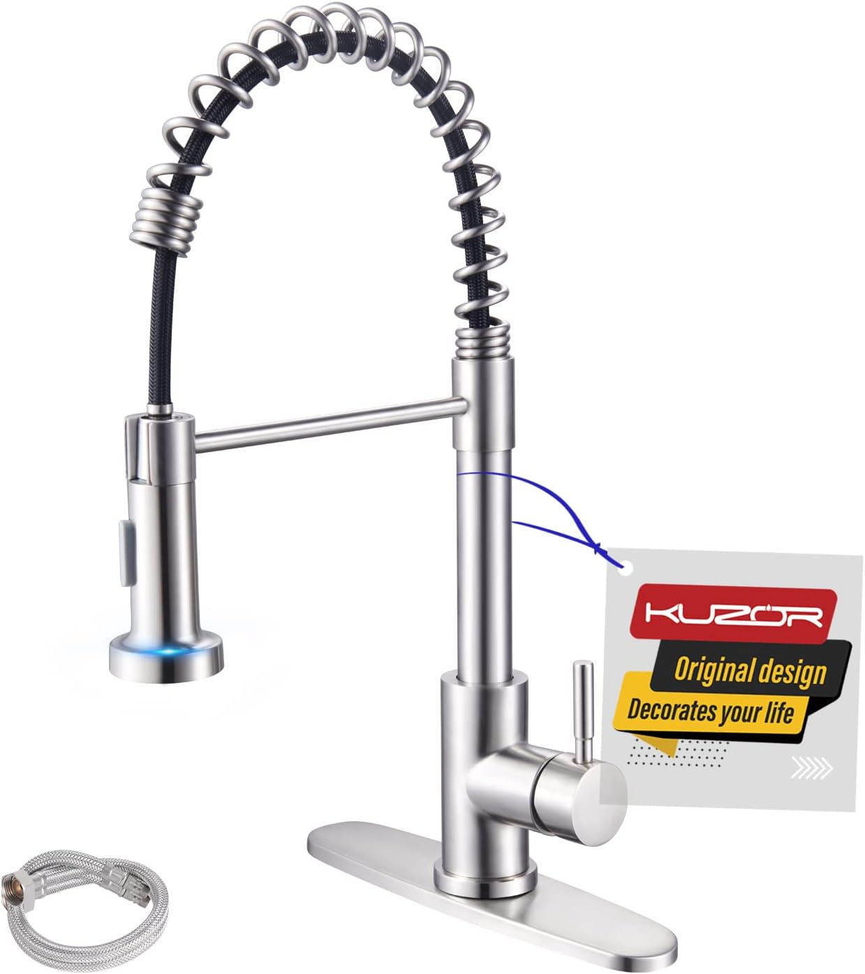 KUZOR Kitchen Faucets Commercial Spring Single Handle 1 or 3 Hole Kitchen Faucet with Pull Down Sprayer Brushed Nickel Kitchen Sink Faucets High Arc ...