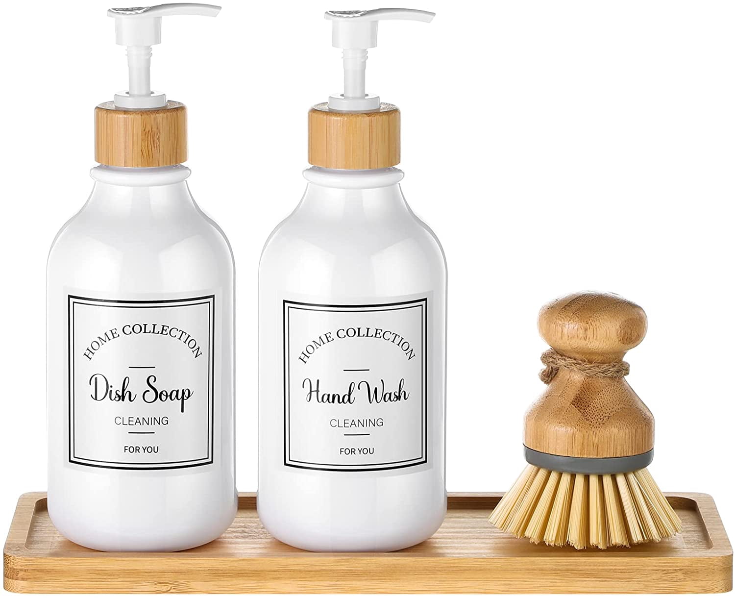 MANSIO Modern Dish Soap Dispenser for Kitchen Sink Bamboo Pump and Soap Tray | Bathroom Soap Dispenser Set for Dish Soap, Hand Soap, Lotion 8 ...