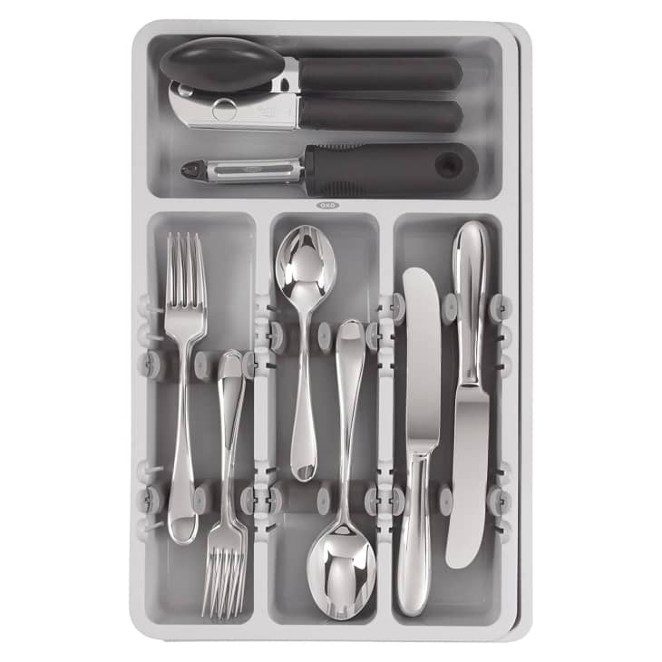 Expandable Utensil Organizer - OXO Our Expandable Utensil Organizer's adjustable dividers hold more utensils by letting you stack them in opposite directions. The expanded space holds longer items for added storage. To adjust dividers, simply pinch the side walls and slide in or out. Non-slip feet keep the Organizer in place. More Info Dimensions 15.25" x 9.75" to 16" x 2.875"